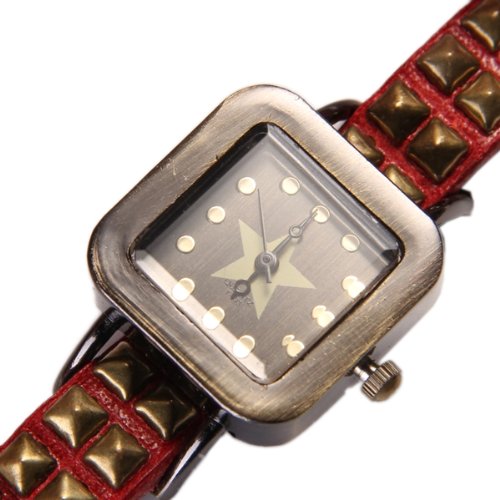 - Guscio dell'orologio quadrato bronzeo, cinturino in vera pelle bruno-rossastra, quadrante vintage con stelle.