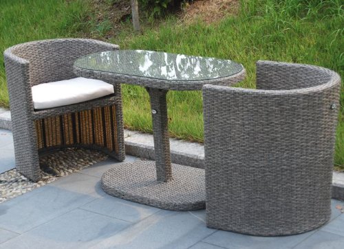 Description : Salottino in polyrattan con finitura color melange completo di cuscini color ecr di spessore 4 cm. - Composto da 1 tavolo ovale e 2 poltrone - Struttura in metallo - In polyrattan resistente ai raggi UV, non tossico - Misure: poltroncina 54x60x70H cm., tavolino 100x50x70Hcm.